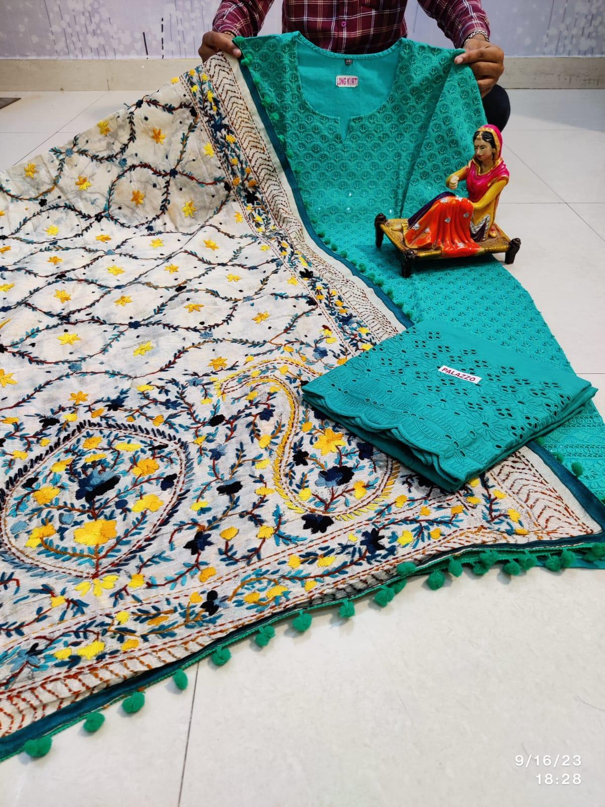 Kurti: The set includes a pure cotton chikankari kurti with a length of 43 inches. The kurti is available in sizes ranging from 38 to 48, ensuring a comfortable fit for various body types.
