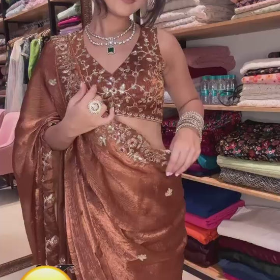 Brown Party Wear Chiffon Sequin Embroidered Saree (New)