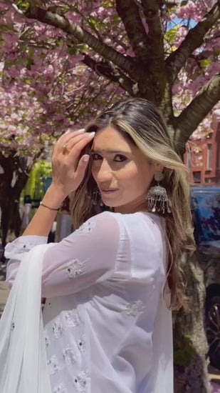 The set includes a beautiful Kurti, a matching Sharara, and a complementary Dupatta, all adorned with a delicate Mirror Booti Jaal design. The ombré effect on the georgette fabric adds a modern twist to the classic Chikankari embroidery, making this set a unique addition to your wardrobe.