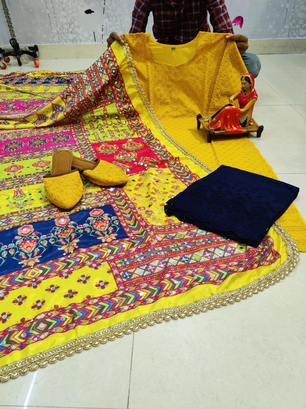 Yellow Chikankari Kurta and black Pallazo With Jutti and Beautiful Multicolor Pakistani Mirror Dupatta