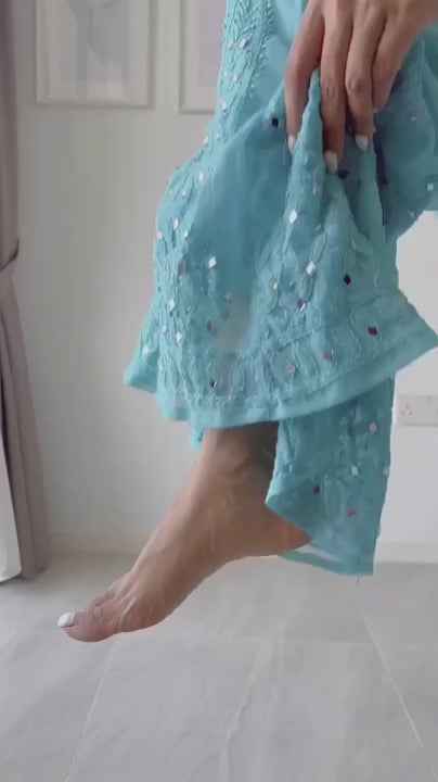 Combo Sets Aqua Blue Mirror Set and White Ethereal Modal Chikankari Kurta 3 pc Set