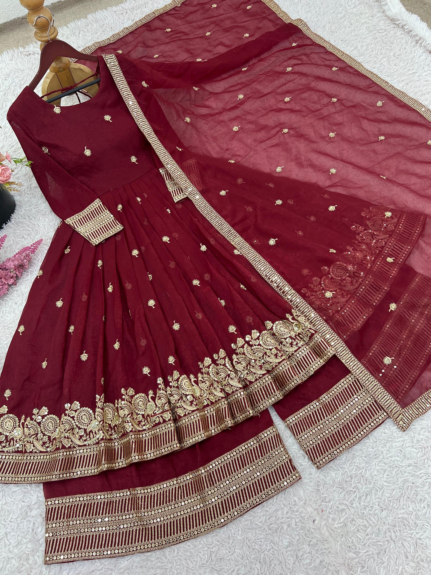 Dark Brown Embroidered Crunchy Silk Wide Flair Kameez and Sharara Set