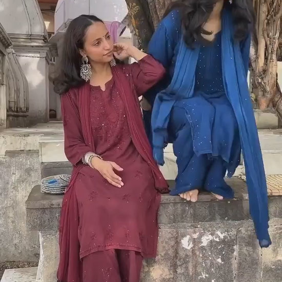 Dark Brown Premium Rayon Chikankari Kurta Palazzo Dupatta Set | Hand Embroidered with Mukesh Work
