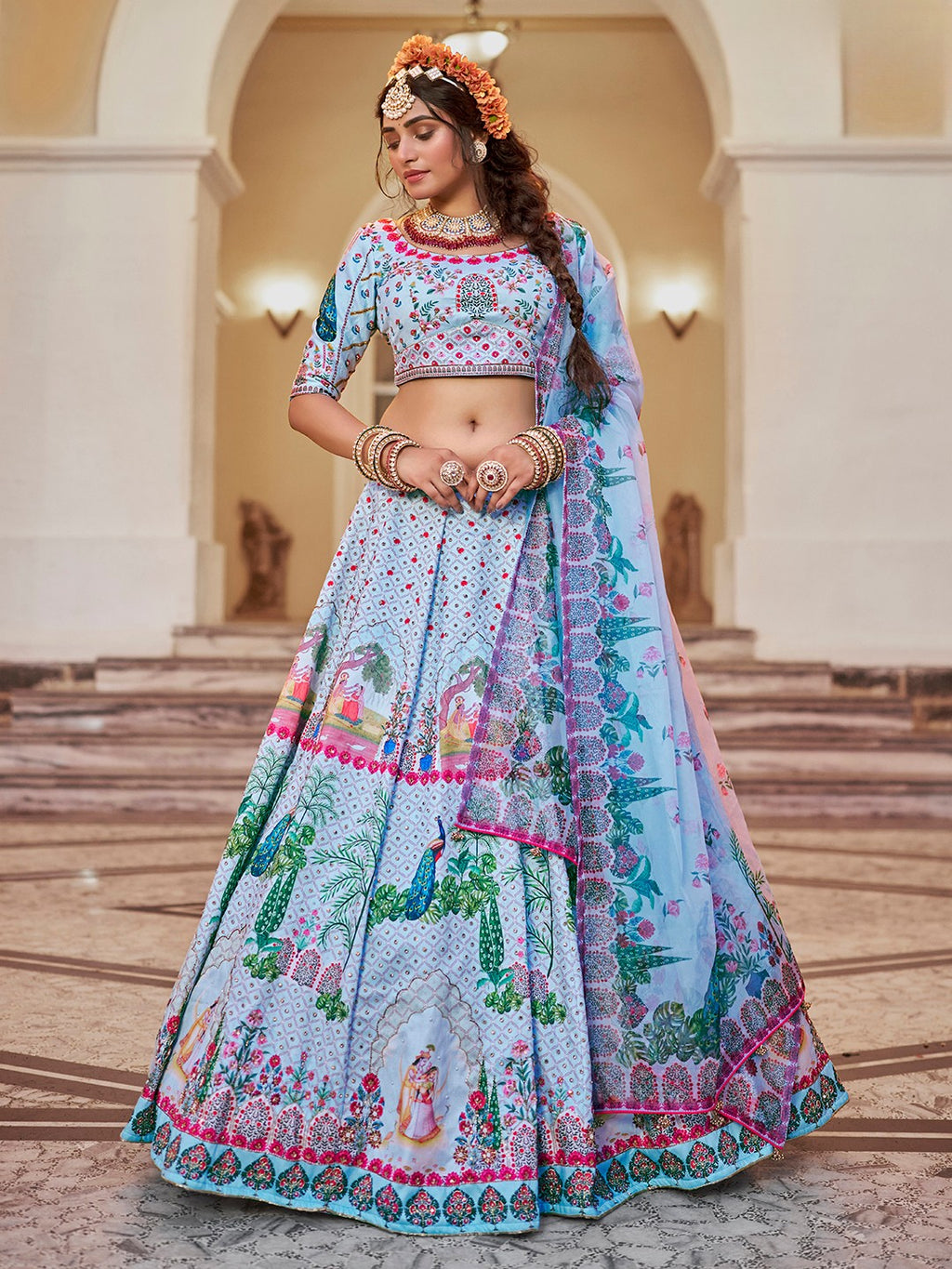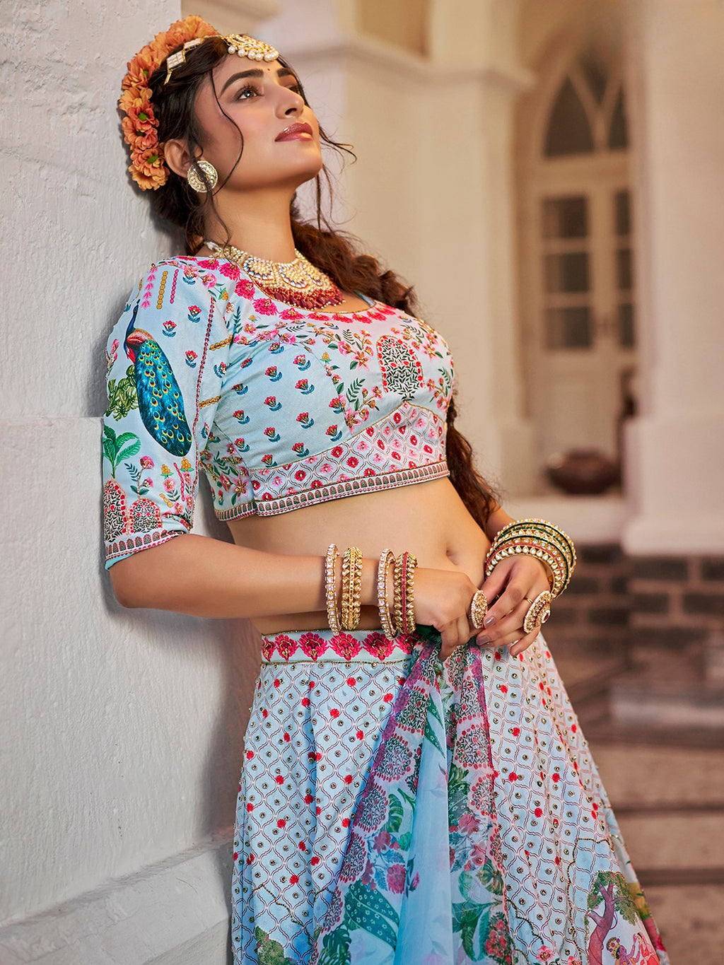 Elegant Light Blue Multi-Color Floral Silk Lehenga Choli with Handwork & Print – A Graceful Wedding & Festive Attire