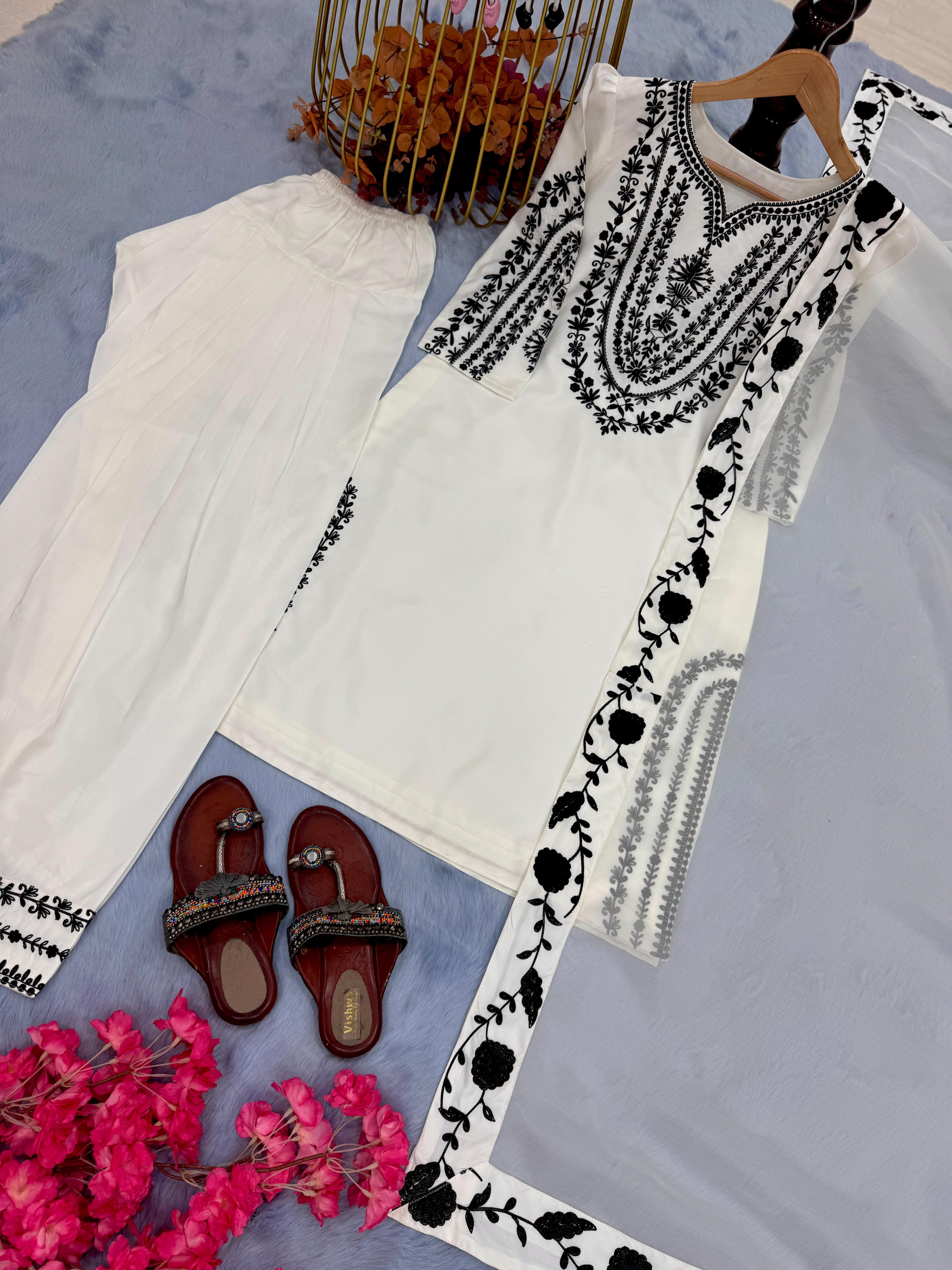 Elegant White Embroidered Crepe Farshi Salwar Suit Set