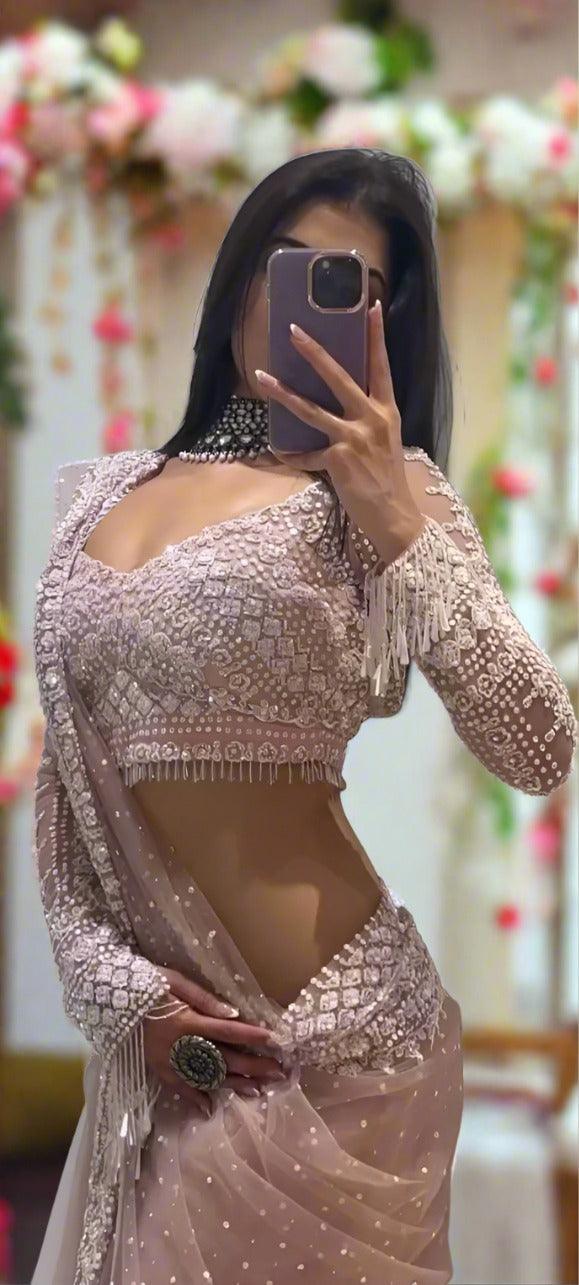 Fabric: Soft net with sequins work, perfectly matching the saree.