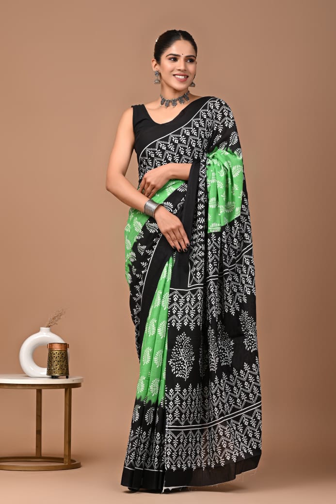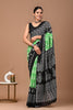 Green Black Ajrakh Cotton Mul Handblock Print Saree with Ready-to-Wear Blouse Set