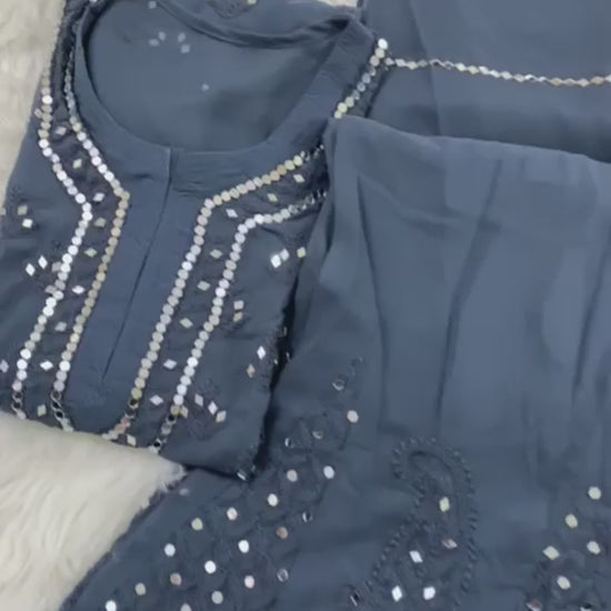The set includes a beautiful Kurti, a matching Sharara, and a complementary Dupatta, all adorned with a delicate Mirror Booti Jaal design. The ombré effect on the georgette fabric adds a modern twist to the classic Chikankari embroidery, making this set a unique addition to your wardrobe.