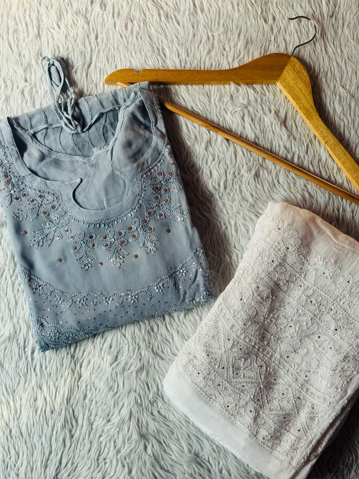 Grey Viscose Chikankari Kurta and Palazzo Set with Mukaish Work (New| Limited Stock)