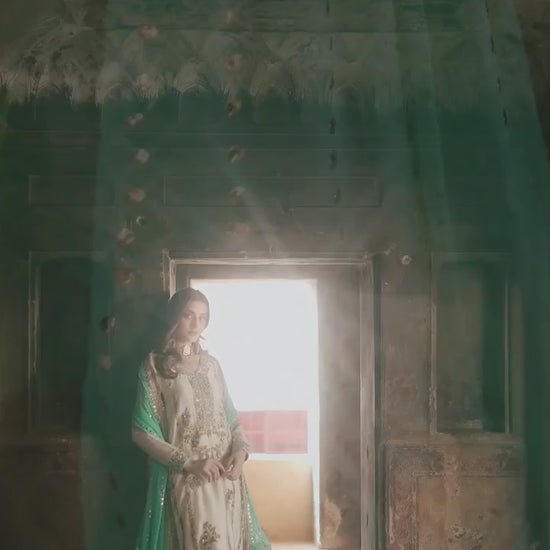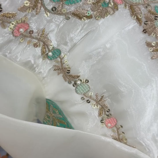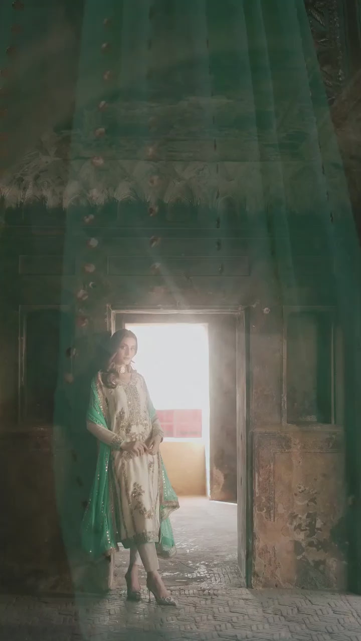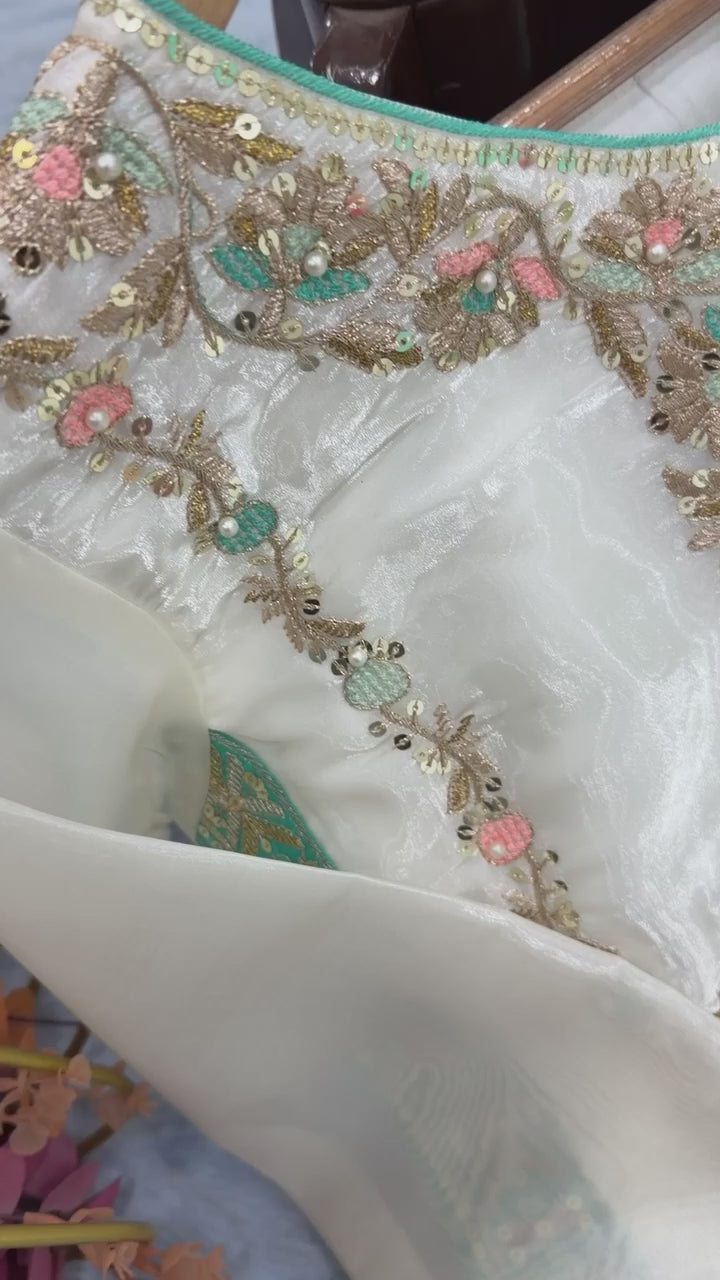 Ivory and Sea Green Designer Party Wear Silk Top, Palazzo & Dupatta Set with Heavy Embroidery