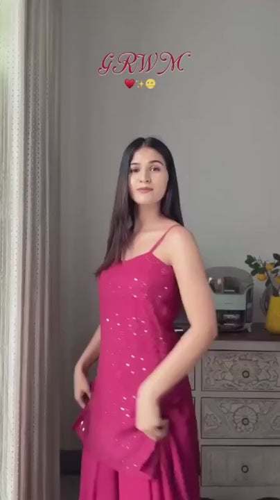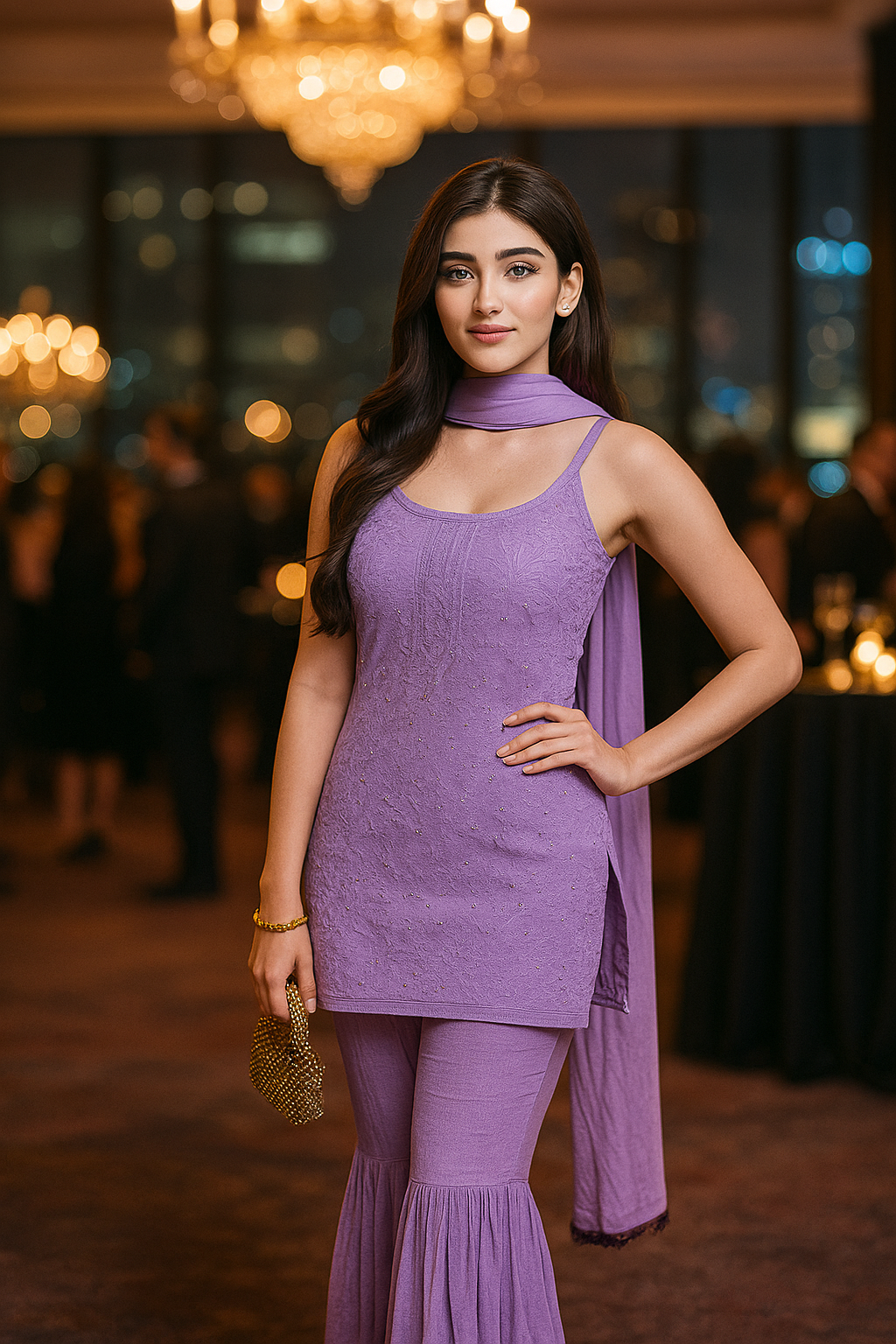 Step into modern elegance with a touch of traditional artistry. Our stunning new Lucknow Chikankari Strappy Gharara Set is designed for the contemporary woman who loves unique style. This ensemble features a chic, short kurti with delicate noodle straps, beautifully adorned with super-intricate Resham thread Chikankari handwork. It's the perfect blend of modern design and heritage craft, ideal for any festive or special occasion.