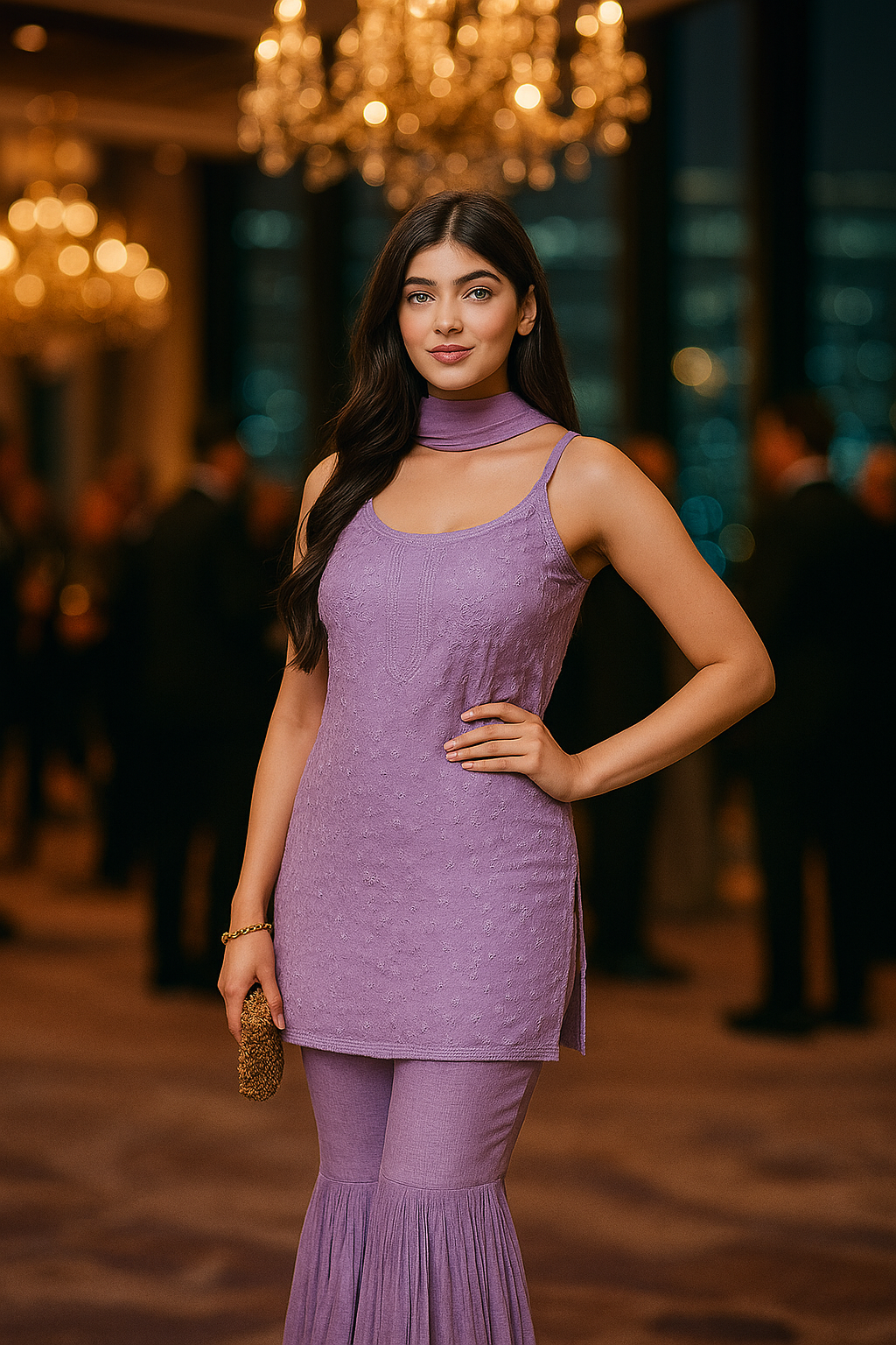 Lavendar Handcrafted Lucknow Chikankari Strappy Gharara Set (New)