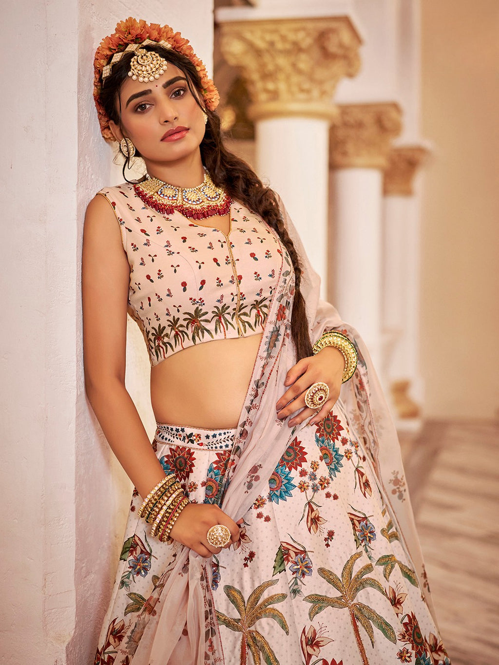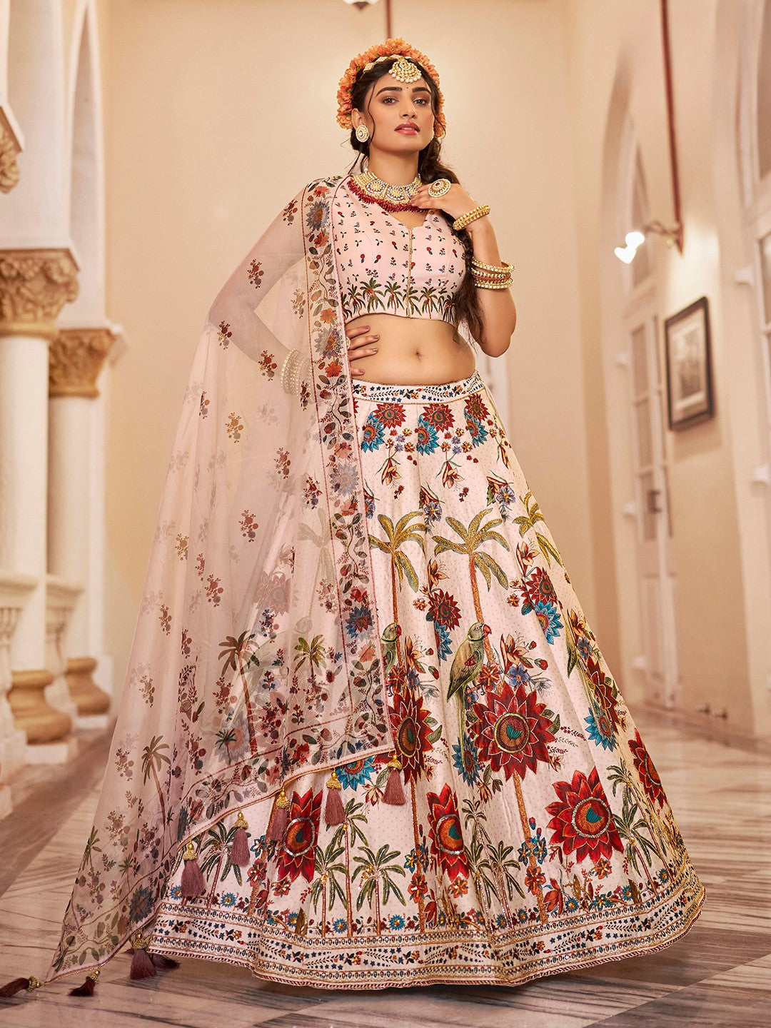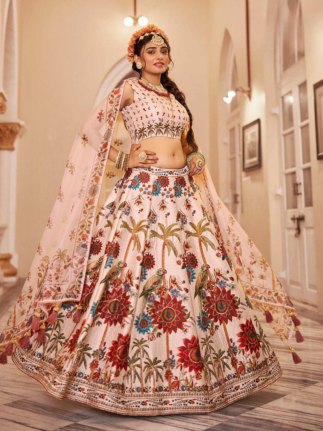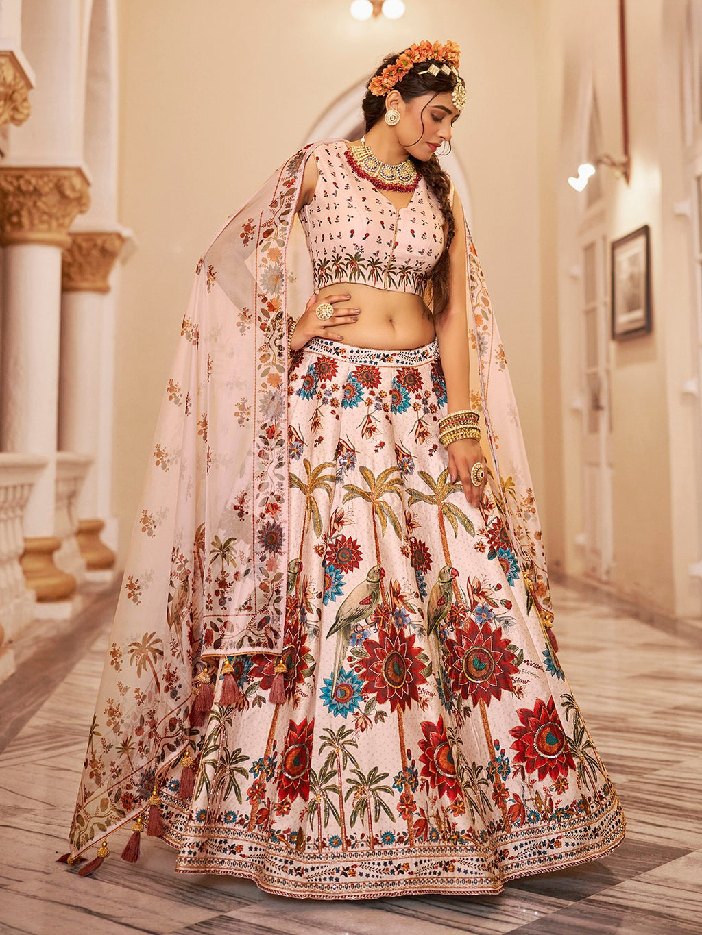 Off-White Design 2 Multi-Color Floral Silk Lehenga Choli with Handwork & Print – Perfect for Weddings & Festive Occasions