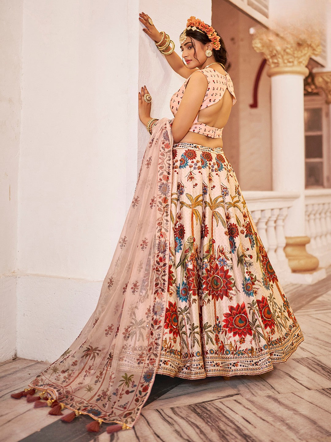 Step into elegance with this Off-White Multi-Color Floral Silk Lehenga Choli, a masterpiece crafted for weddings, festive celebrations, and grand occasions. The luxurious silk fabric is adorned with delicate floral prints and intricate handwork, offering a regal and sophisticated look. Paired with a lightweight organza dupatta, this ensemble exudes charm and grace, making it a perfect choice for wedding guests and bridesmaids.
