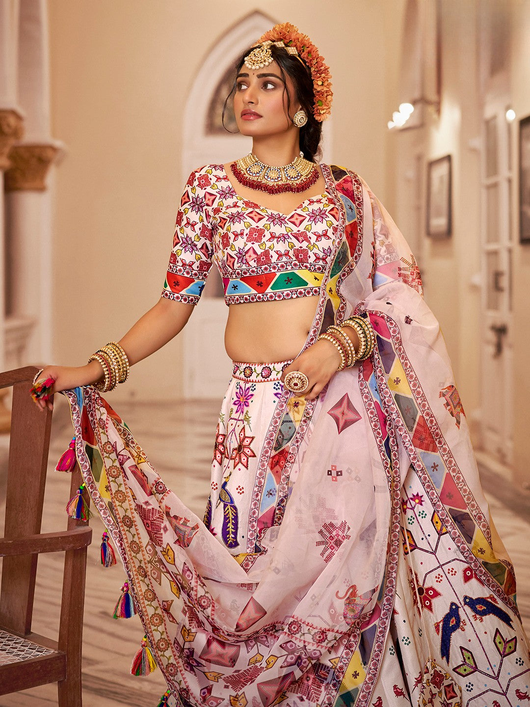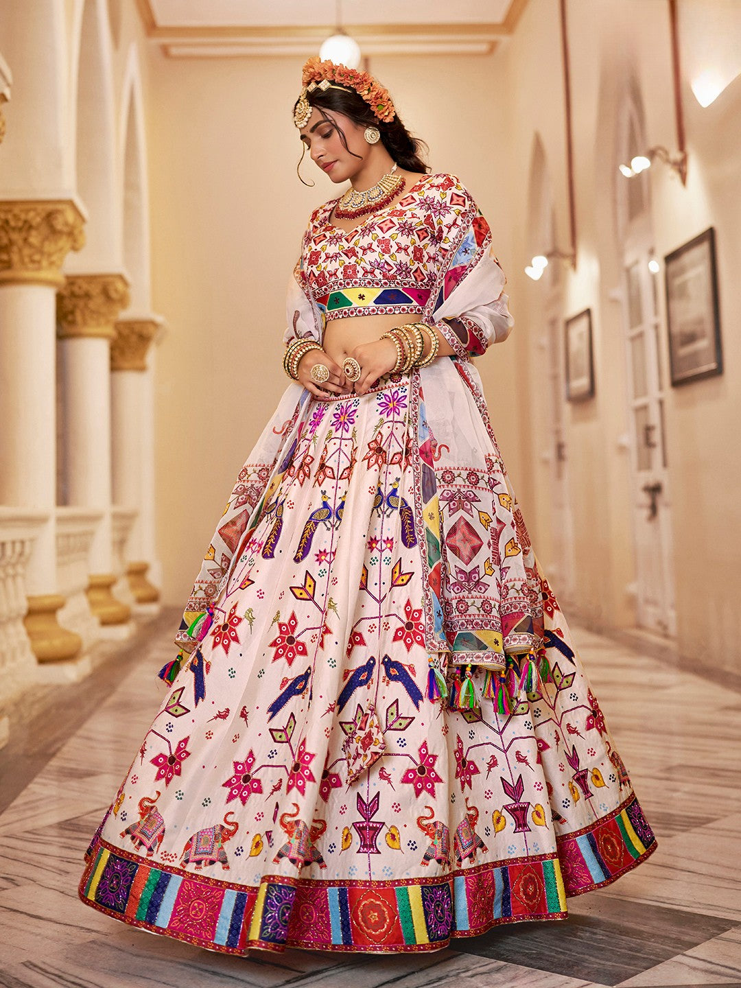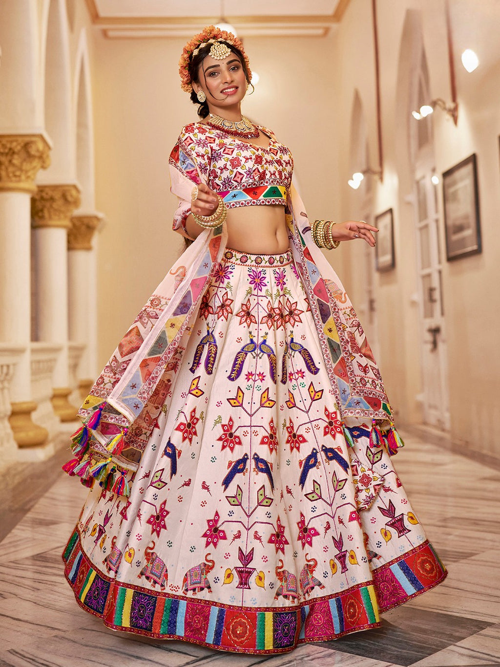 🤍 Lehenga Fabric: Premium Silk with Multi-Color Floral Print & Handwork