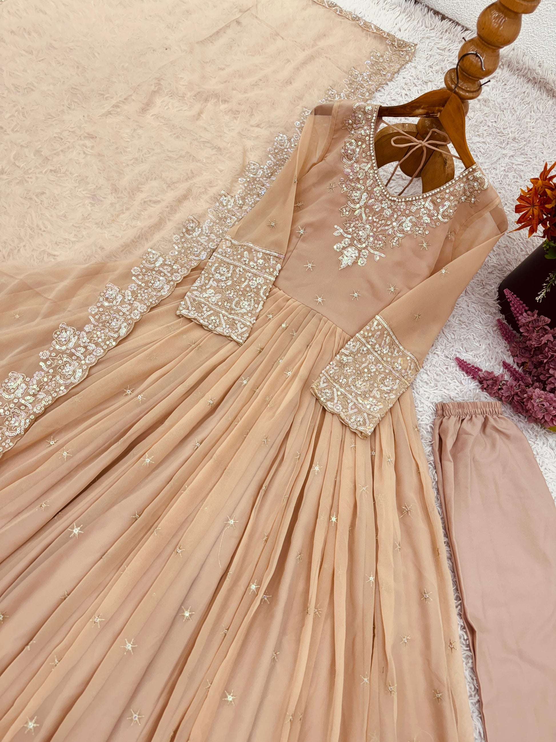Peach Embroidered Georgette Women's Party Wear Gown Set