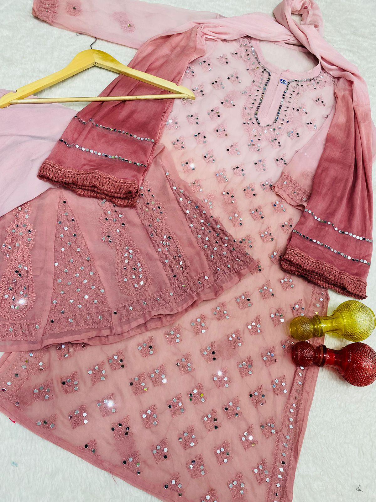 At the heart of this ensemble lies a meticulously crafted kurti, featuring heavy buti jaal and mesmerizing mirror work. The intricate chikankari detailing showcases the skill of Lucknawi artisans, adding an element of timeless elegance to your look. It's the perfect blend of traditional craftsmanship and contemporary style, making it a must-have addition to your wardrobe.
