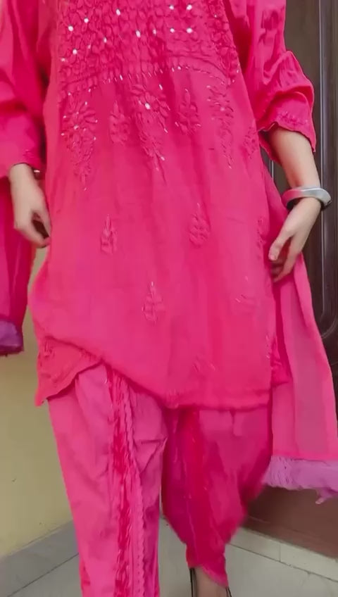 This ensemble is perfect for any occasion, from festive celebrations to casual outings. The intricate handwork Chikankari and Mukesh kaamdani work highlight the skilled craftsmanship, making each piece unique and timeless.
