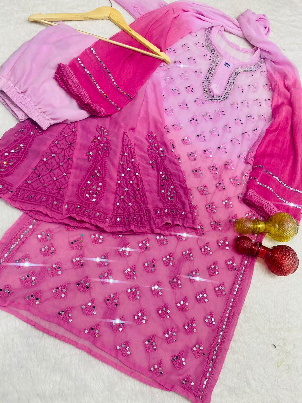 Bright Pink Enchanting Lucknawi Jaal - Chikankari Festive Set - Kurti, Sharara & Dupatta -(Inner Included)