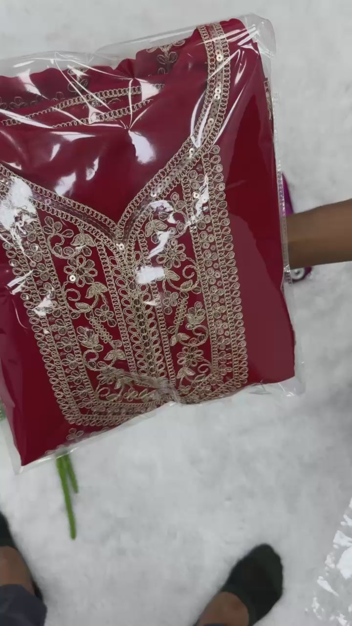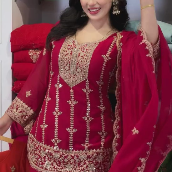Red Designer Party Wear Faux Georgette Top, Palazzo & Dupatta Set