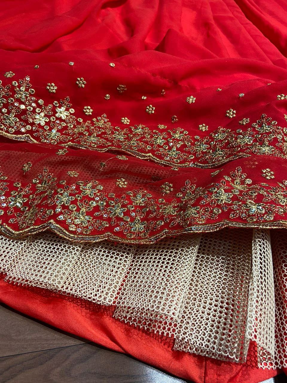 - Fabric: Double ruffle layers made from premium georgette, embellished with beautiful embroidery, sequins, and zari work.