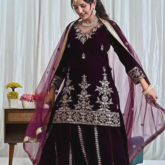 Embrace the allure of velvet and intricate detailing with this perfect party wear ensemble. This Wine Velvet Sharara Kameez Party wear set is ideal for celebrations, weddings, and special occasions where you want to exude charm and sophistication.