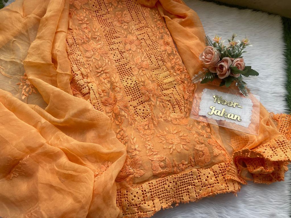 Orange Karachi Splendor: Qureshiya Crocia Suit with Dupatta