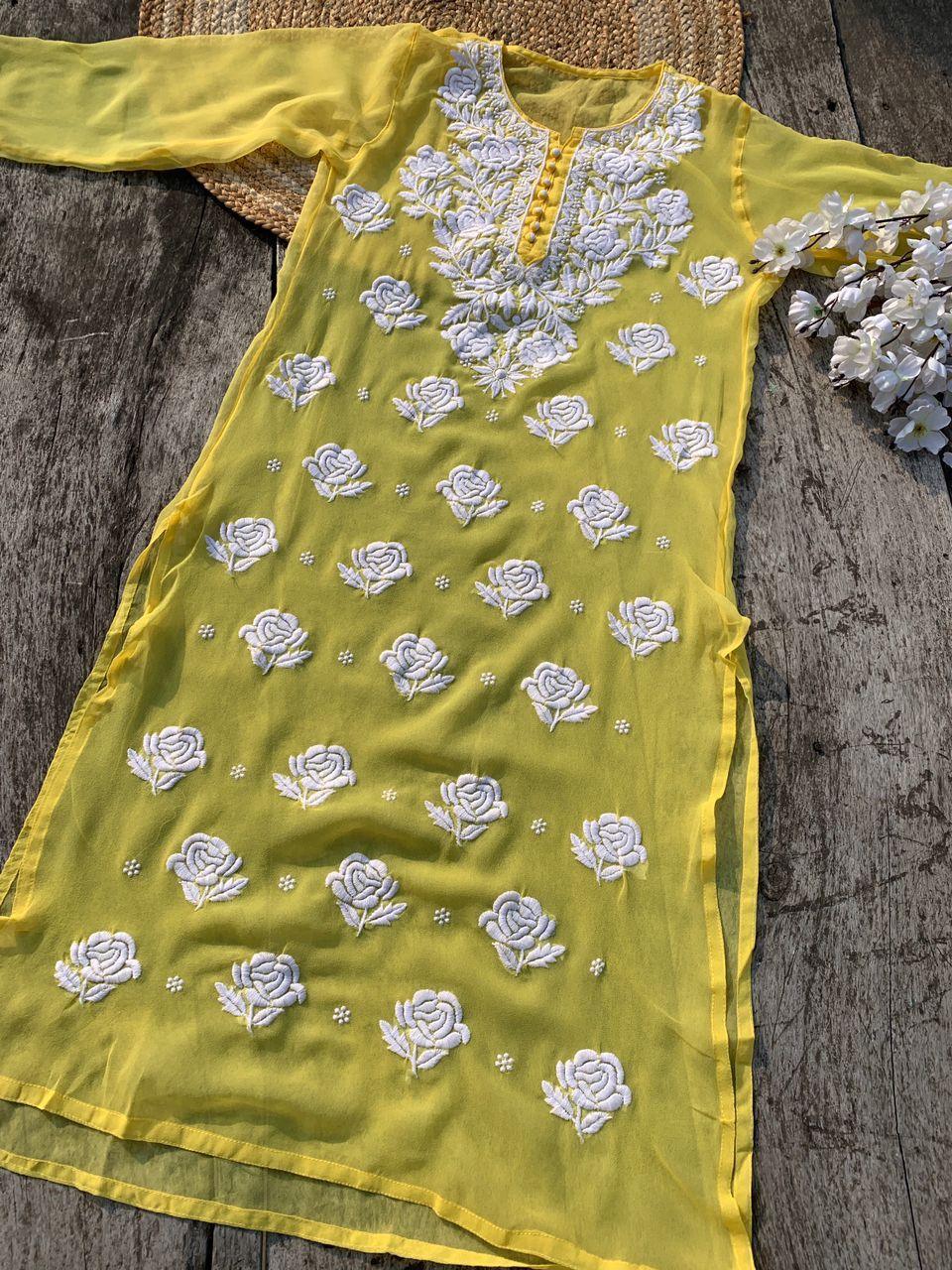 Yellow 🌹 Georgette Rose Keel Long Kurtis 🌹 Inner included
