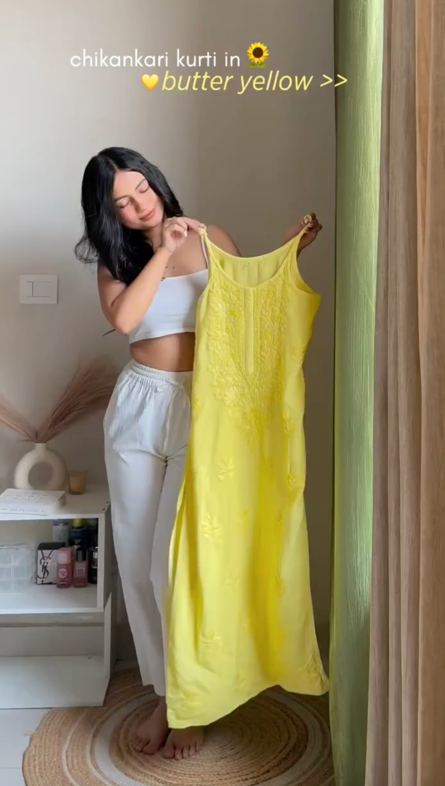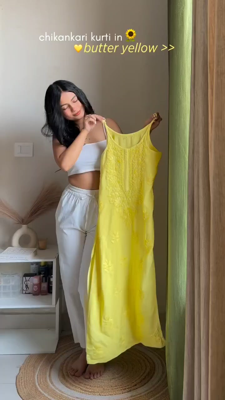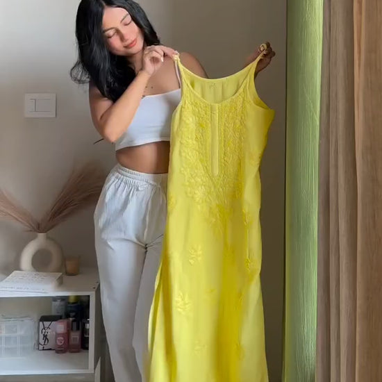 Yellow Lucknowi Chikankari Rayon Noodle Strap Kurti Set